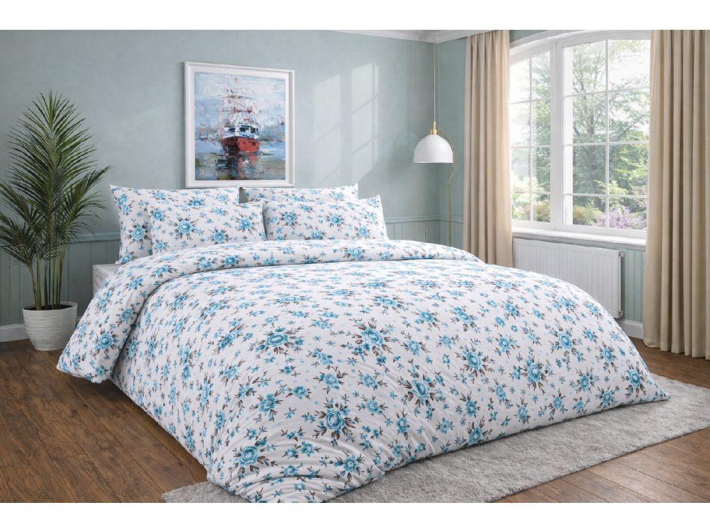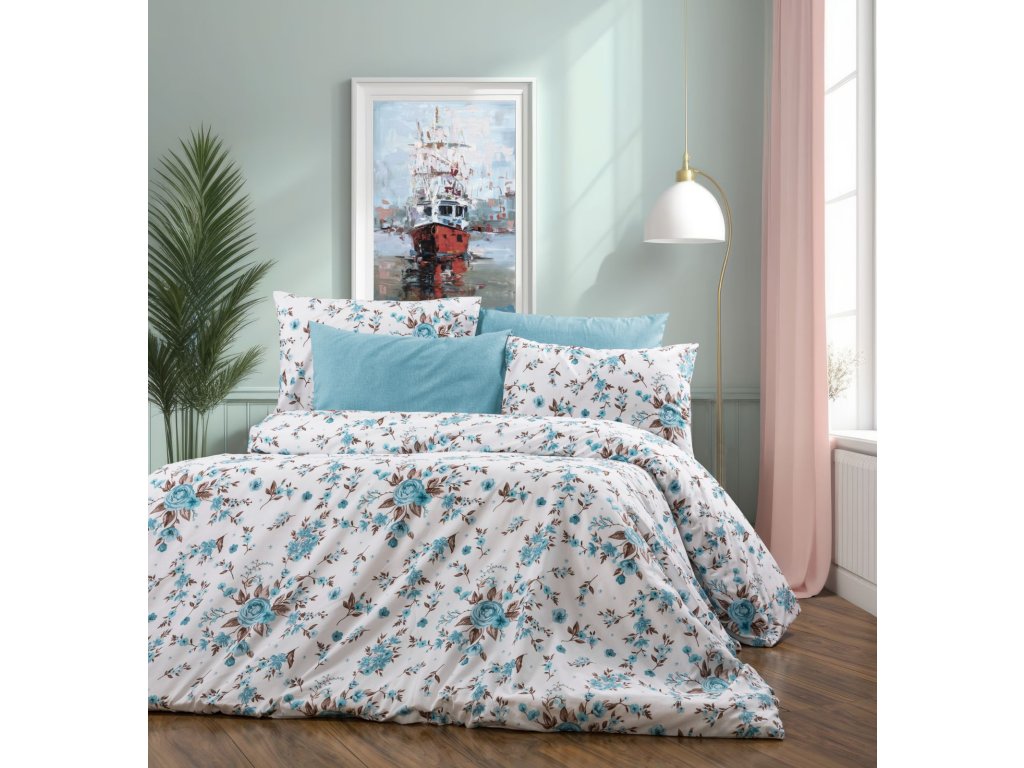 Dominantní je bílá a tyrkysová barva, která vytváří klidnou a uvolněnou atmosféru. Povlečení je zdobeno jemným vzorem větví a květů, který dodává soupravě na eleganci a přírodním dojmech, je ušité u nás ve firmě s více než 20 letou tradicí z vysoce kvalitní bavlny, která je měkká, prodyšná a odolná.