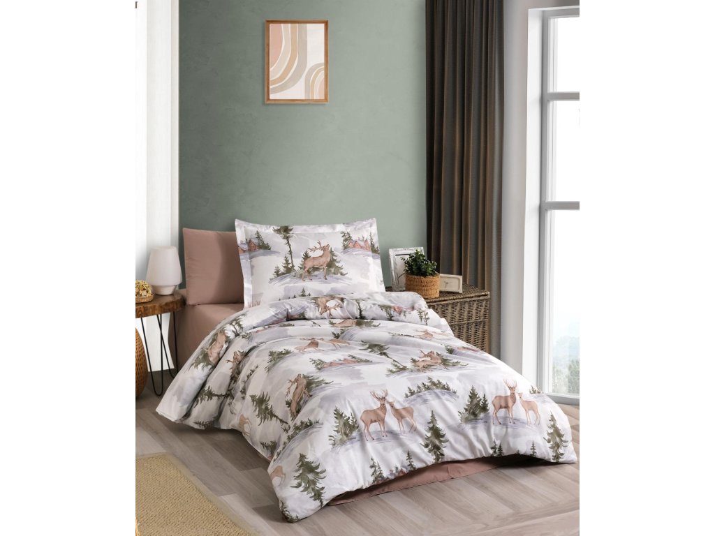 Vneste do své ložnice harmonii zimní přírody s tímto nádherným povlečením s motivem jelenů. Jemný potisk lesní krajiny v tlumených přírodních tónech – béžová, hnědá, šedá a zelená – navodí pocit klidu a útulna, ideální pro chladné zimní večery.