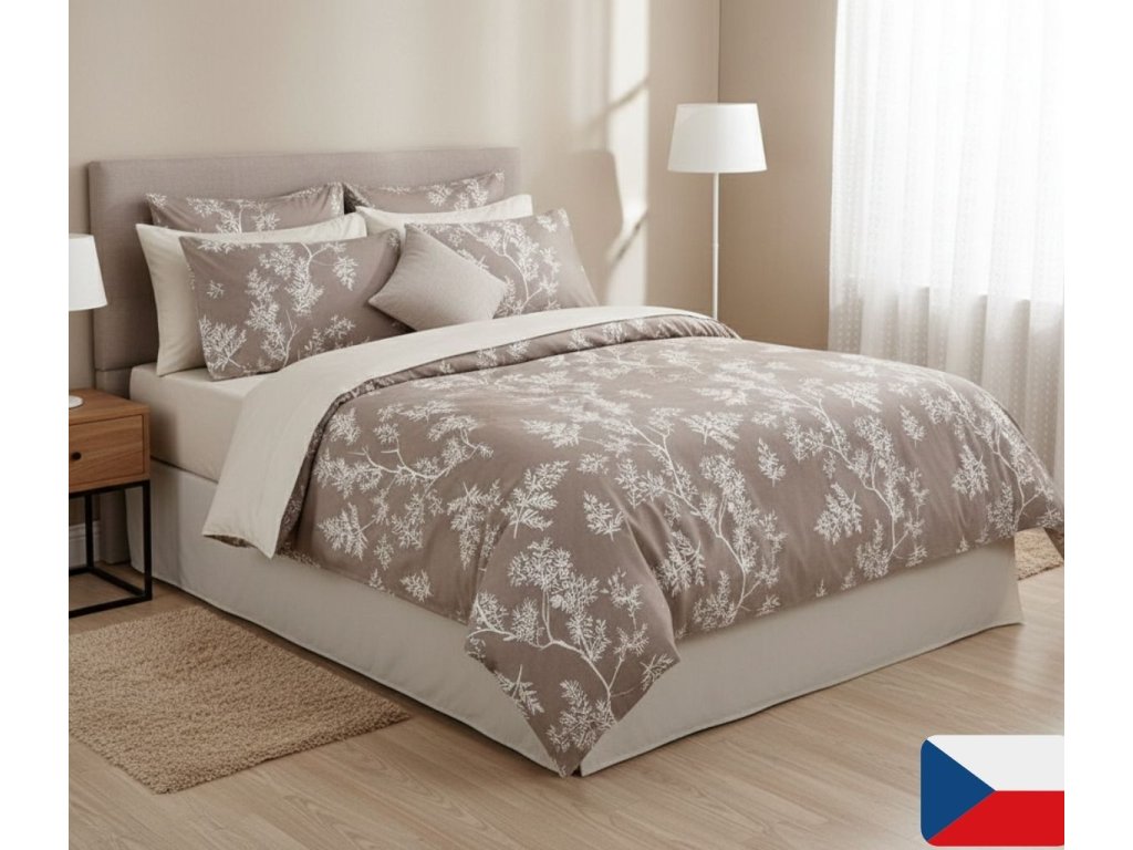 Dominantní je béžová barva, která vytváří klidnou a uvolněnou atmosféru. Povlečení je zdobeno jemným vzorem větví a listů v bílé barvě, který dodává soupravě na eleganci a přírodním dojmech, je ušité u nás ve firmě s více než 20 letou tradicí z vysoce kvalitní bavlny, která je měkká, prodyšná a odolná.