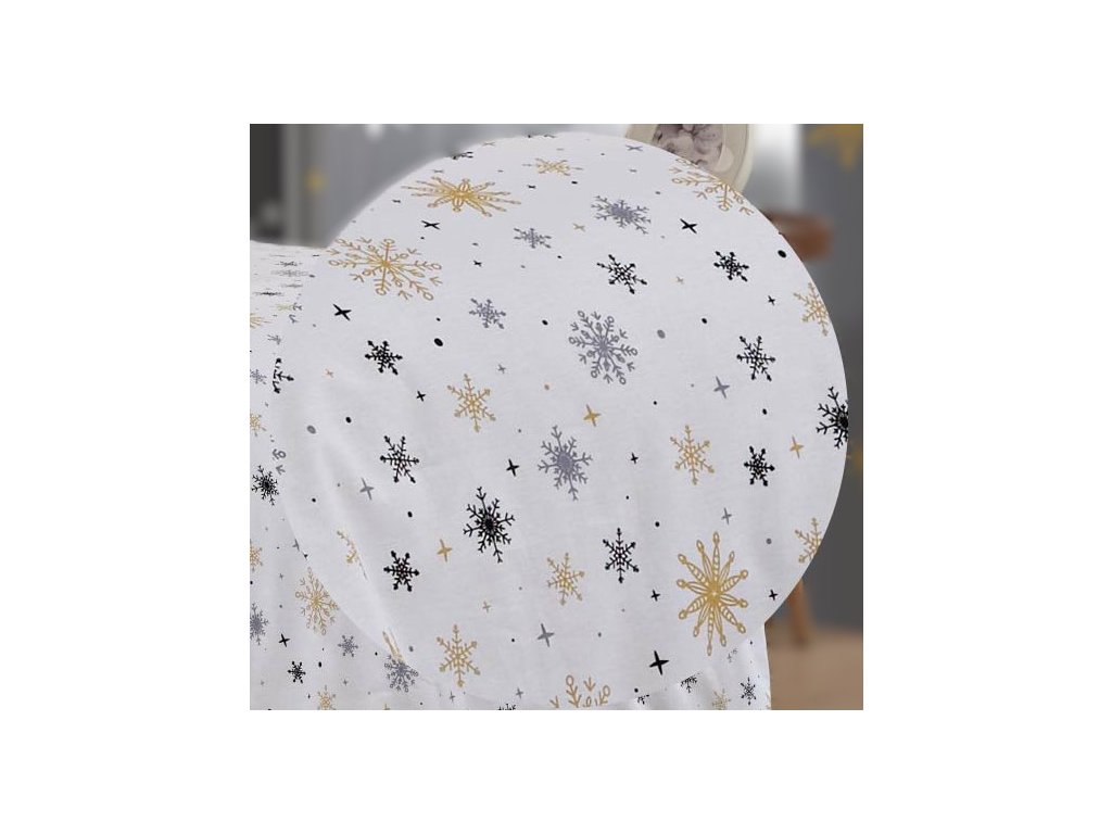 Jemný bavlněný materiál a hravý vzor se sněhovými vločkami v černé, zlaté a šedé barvě navodí pocit pohody, tepla a radosti z blížících se Vánoc.