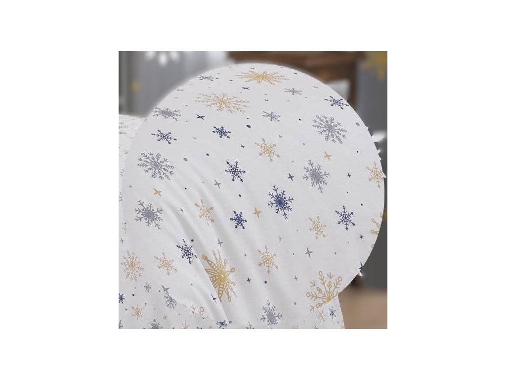 Jemný bavlněný materiál a hravý vzor se sněhovými vločkami v modré, zlaté a šedé barvě navodí pocit pohody, tepla a radosti z blížících se Vánoc.
