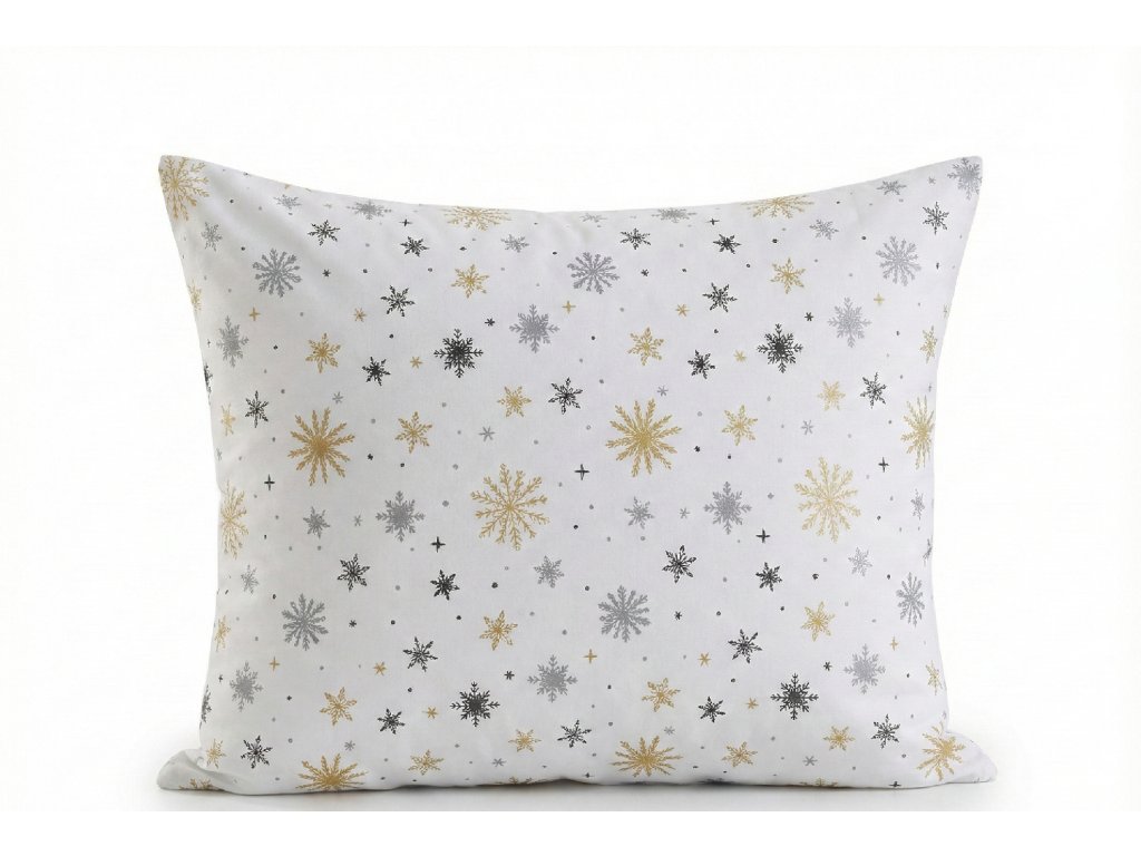 Jemný bavlněný materiál a hravý vzor se sněhovými vločkami v modré, zlaté a šedé barvě navodí pocit pohody, tepla a radosti z blížících se Vánoc.