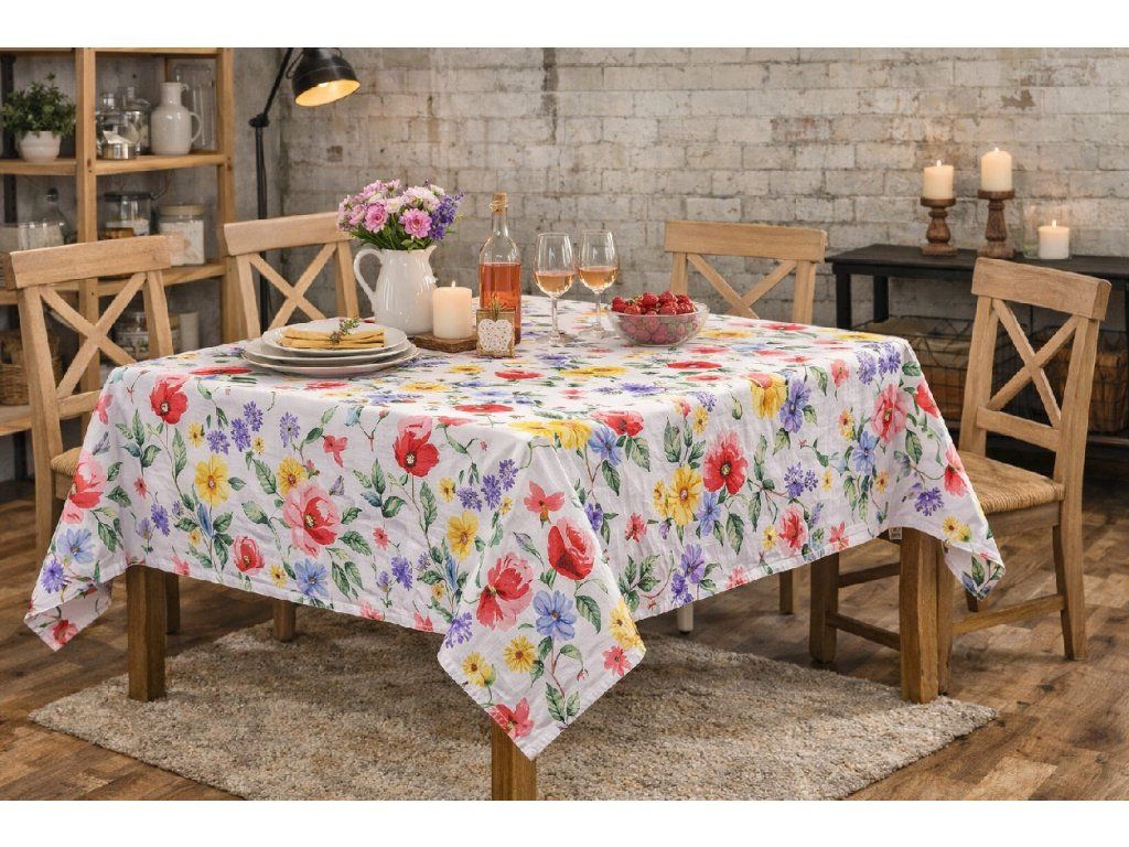 Veselý ubrus s motivem barevných lučních květů pro svěží a útulné stolování.