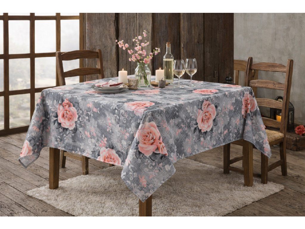 Elegantní ubrus s romantickým motivem růží v jemných růžových odstínech na šedém podkladu dodá vašemu stolu stylový a útulný vzhled. Květinový design působí velmi něžně a skvěle doplní moderní i rustikálně laděné interiéry. Ubrus nejen krásně ozdobí jídelní stůl, ale zároveň jej chrání před znečištěním při každodenním používání.
