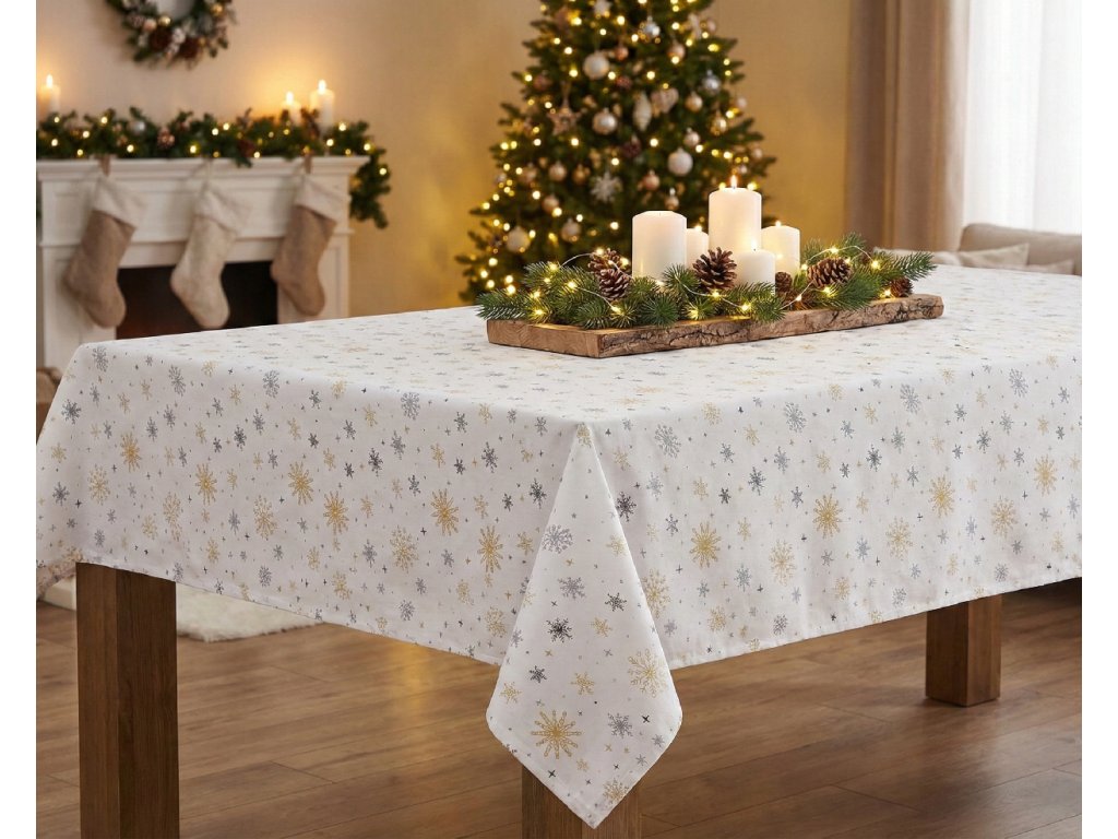 Vneste do svého domova kouzlo Vánoc s tímto elegantním vánočním ubrusem, který zaujme jemným vzorem sněhových vloček v kombinaci šedé a zlaté barvy. Bílý podklad působí čistě a slavnostně, zatímco zlaté akcenty dodávají ubrusu luxusní nádech.